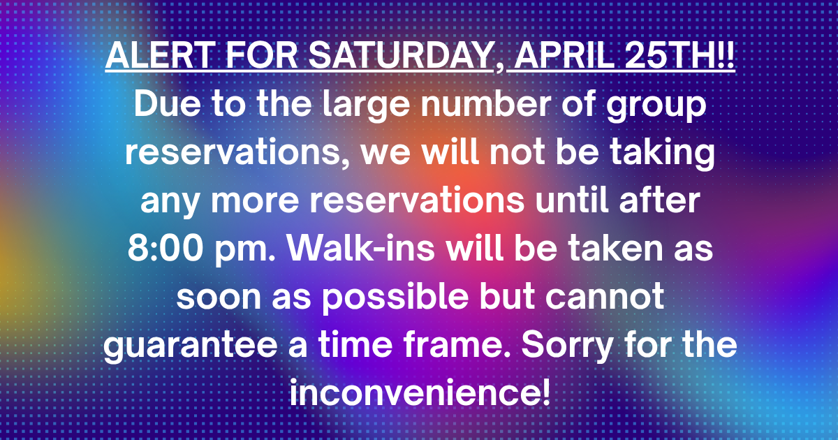 Serving Food: 4:00-9:00 PM (No Reservations)